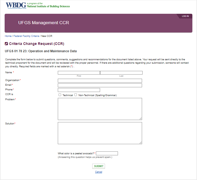 The Submit UFGS CCR for Section command will open the Whole Building Design Guide (WBDG) Website's UFGS Management CCR page for the active Section in the default browser. Use the form to submit a Criteria Change Request (CCR) for the active Section to submit comments, suggestions, and recommended changes to the assigned technical proponent for review. When further clarification or discussion is required the technical proponent will reach out directly.