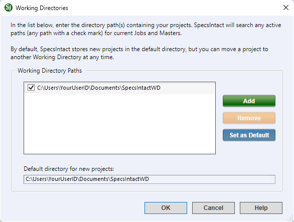 The Working Directories window is utilized to configure and manage project Working Directories, offering capabilities to add, remove, and designate a default. The Working Directories are an integral component of SpecsIntact, serving as the repository for all Jobs and Masters. The system allows the configuration of one or multiple Working Directories, each designed with a distinct internal structure for storing Jobs, Masters, Templates, and Exports.